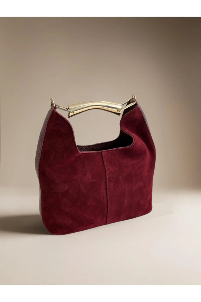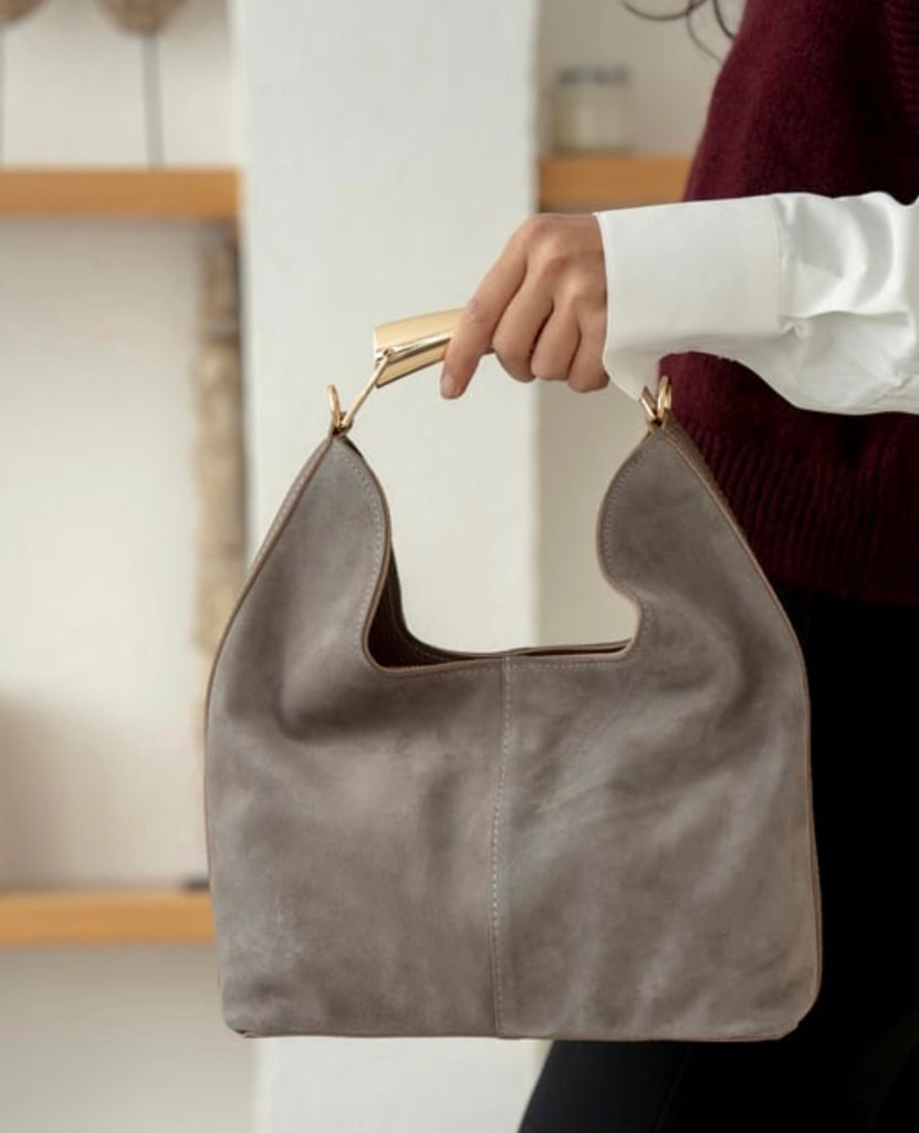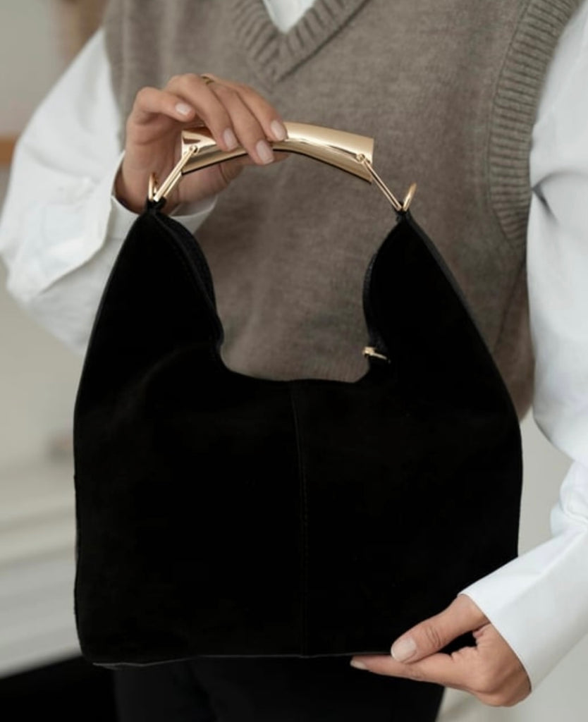 Elegantna torba od antilopa se zlatnom metalnom ručkom i dugim kaišem.